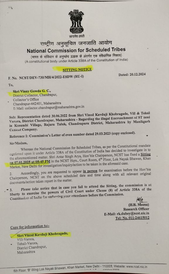 नई दिल्ली/चंद्रपुर: मौजा कुसुंबी के 24 मूल आदिवासियों के न्याय और हक की लड़ाई में एक महत्वपूर्ण मोड़ आ गया है।  विनोद कवडूजी खोब्रागड़े की शिकायत पर राष्ट्रीय अनुसूचित जनजाति आयोग ने चंद्रपुर के वर्तमान जिलाधिकारी  विनय गौड़ा (जी.सी.) को 7 जनवरी 2025 को शाम 5:45 बजे दिल्ली कोर्ट में पेश होने का नोटिस जारी किया है।