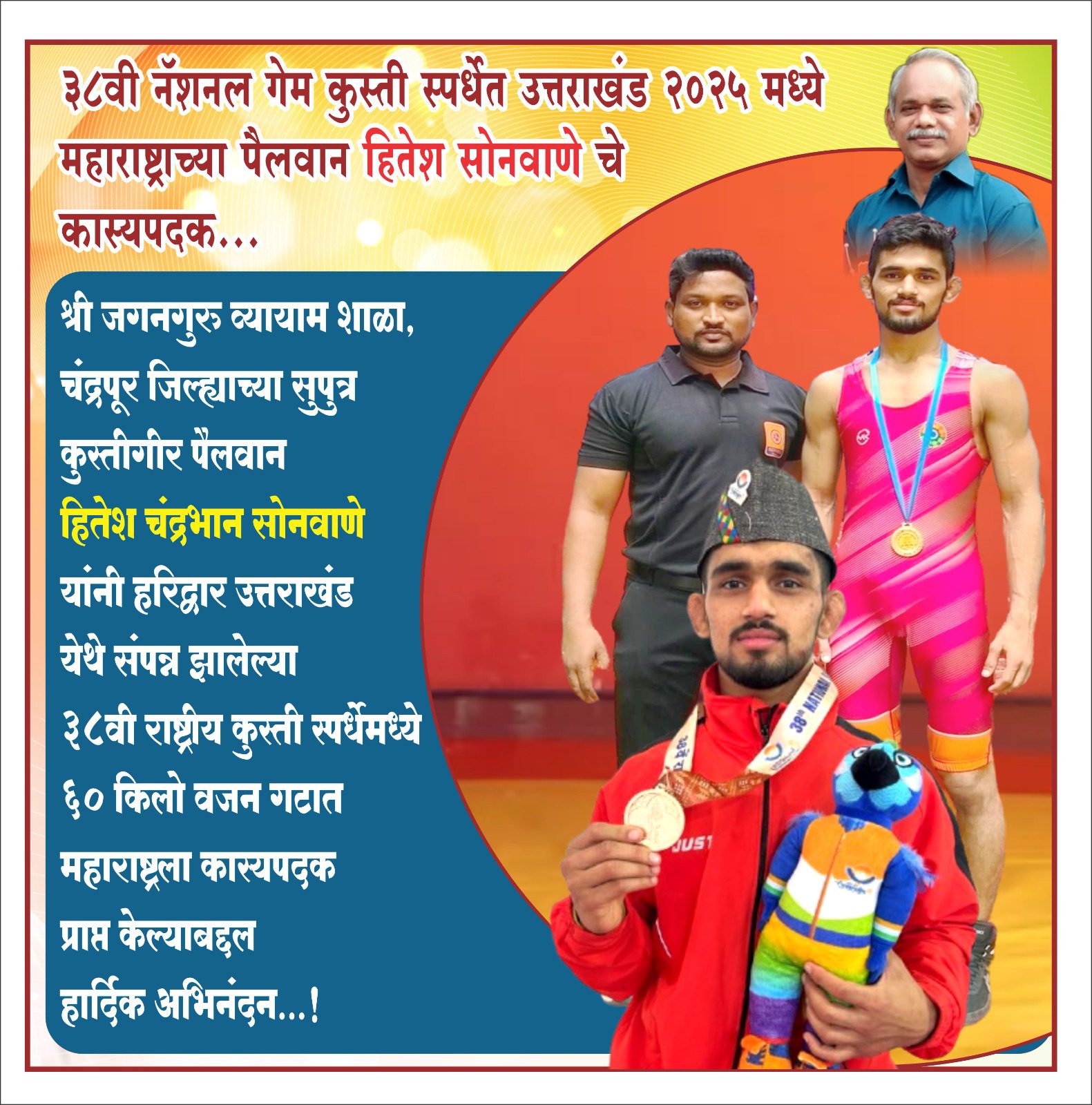 चंद्रपुर जिले के श्री जगनगुरु व्यायामशाला के कुश्तीगिर हितेश सोनवणे ने इस उपलब्धि के साथ एक नया इतिहास रच दिया है। वह वरिष्ठ राष्ट्रीय कुश्ती प्रतियोगिता में पदक जीतने वाले चंद्रपुर जिले के पहले पहलवान बन गए हैं। उनकी इस शानदार उपलब्धि पर जिले में हर्ष का माहौल है।