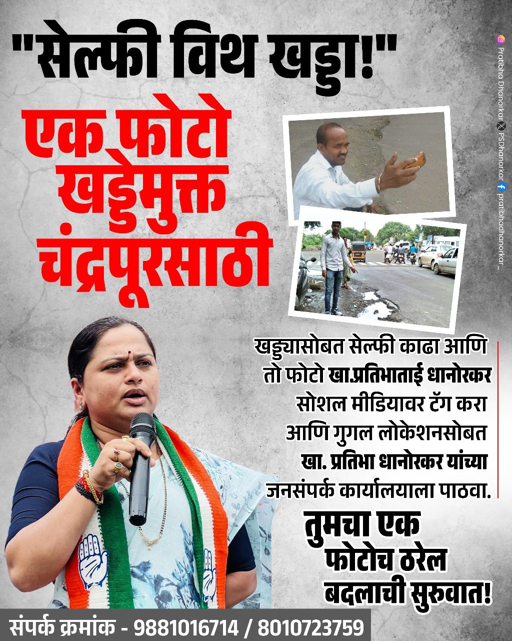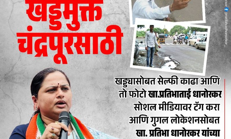 चंद्रपुर: शहर और आसपास के क्षेत्रों में सड़कों पर बने खतरनाक गड्ढों की समस्या को प्रशासन के समक्ष जोरदार तरीके से उठाने और नागरिकों को इस मुहिम में शामिल करने के उद्देश्य से सांसद प्रतिभा धानोरकर ने “सेल्फी विद् गड्ढा!” नाम का एक अभिनव अभियान शुरू किया है।