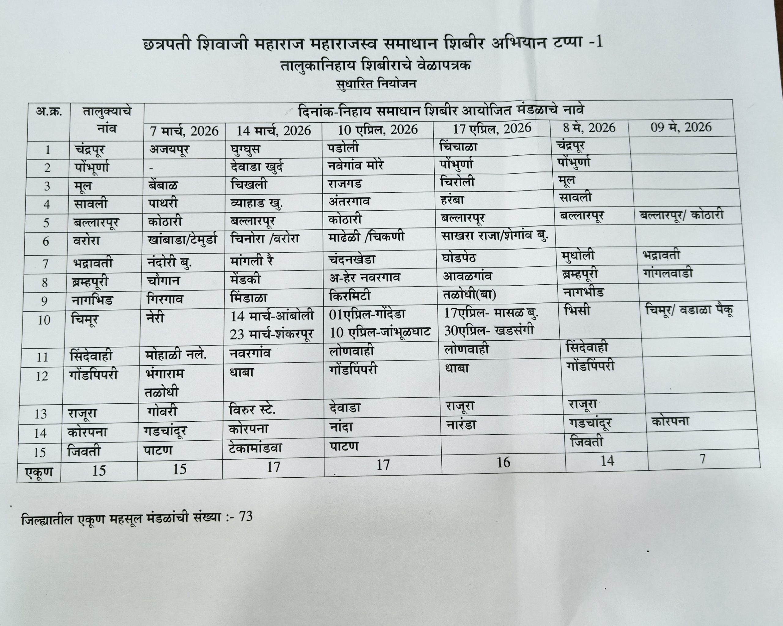 चंद्रपुर के जिलाधिकारी विनय गौडा जी.सी. ने जिले के सभी नागरिकों से अपील की है कि वे मार्च से मई 2026 के दौरान आयोजित होने वाले इन समाधान शिविरों में भाग लेकर अपनी राजस्व संबंधी समस्याओं का त्वरित समाधान प्राप्त करें।